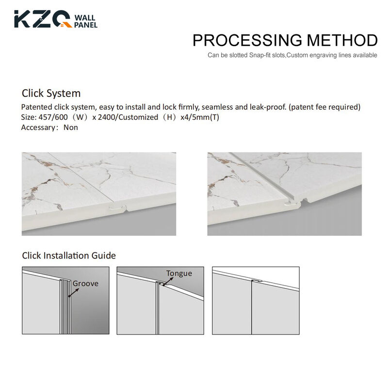 एसपीसी वॉल पैनल 4 मिमी और 5 मिमी मोटाई में उपलब्ध है, जो इसे विभिन्न स्थापना आवश्यकताओं के लिए उपयुक्त बनाता है। यूनिलिन लॉक इंस्टॉलेशन सिस्टम इसे स्थापित करना आसान बनाता है, जिससे समय और प्रयास की बचत होती है। एसपीसी वॉल पैनल टाइल का क्लिक स्टोन डिज़ाइन दीवार पर DIY इंस्टॉलेशन के लिए सुविधाजनक है, और इसे फर्श के रूप में भी इस्तेमाल किया जा सकता है।